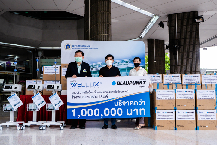 ทั้งนี้นายธัญญวิชญ์ ประธานบริหาร พร้อมนางสาวภัคคินี สกุลอาริยะ กรรมการผู้จัดการฝ่ายการตลาด บริษัท เวลลักซ์ (ประเทศไทย) จำกัด เจ้าของผลิตภัณฑ์เวลลักซ์ สปอร์ตไลท์ โซล่าเซลล์ LUMILED+BYD Battery (ลูมิ-แอลอีดี พลัส บีวายดี แบตเตอรี่) และ บริษัท เตชินท์ อินเตอร์เทรด จำกัด ผู้นำเข้าแบรนด์ BLAUPUNKT อย่างเป็นทางการผู้เดียวในประเทศไทย ได้ขอร่วมเป็นส่วนหนึ่งในการช่วยต่อลมหายใจให้กับผู้ป่วยภาวะวิกฤตให้ผ่านพ้นและกลับมามีชีวิตปกติ โดยการส่งมอบเครื่องช่วยหายใจชนิดอัตราการไหลสูง (High Flow Oxygen Therapy Device) รุ่น H-80M จำนวน 3 เครื่อง และ ชุดท่อช่วยหายใจ (High Flow) 15 ชุด ให้แก่โรงพยาบาลรามาธิบดี ซึ่งขณะนี้จำนวนเตียงผู้ป่วยวิกฤตและอุปกรณ์การรักษาโดยเฉพาะเครื่องช่วยหายใจประสบภาวะขาดแคลน โดยมี ศ.นพ.พรชัย สิมะโรจน์ หัวหน้าศูนย์นโยบายและการจัดการสุขภาพโรงพยาบาลรามาธิบดี เป็นผู้รับมอบ